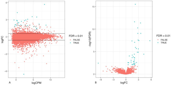10]. Data generated from the edgeR analysis were used for creating graphical plots. The patient cohort with early recurrence was defined as the population of interest for the purpose of differential gene expression analysis, whereas the remaining cohort (no early recurrence) served as the control population. After the visualization of expression data, the threshold for inclusion was set at genes with a read count < 1 count per million (CPM) in at least 9 samples. The trimmed mean method (TMM) was used within edgeR to determine the normalization factors for the respective gene library sizes. Differences in gene expressions were calculated and incorporated into a negative binomial model. A False Discovery Rate (FDR) of ≤ 0.01 was used as a threshold for gene identification.