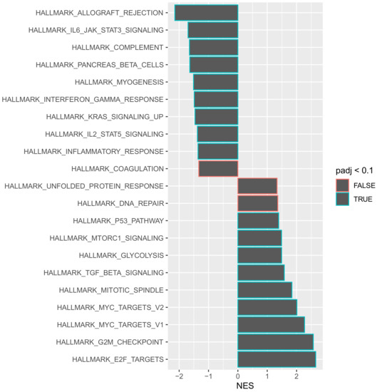 https://www.genome.jp/kegg/ (accessed on 6 October 2021). The edgeR results were compared to the ranked gene list. Significant pathway enrichment was defined by an FDR < 0.01. GSEA pathway analysis results were presented as stacked bar-charts.