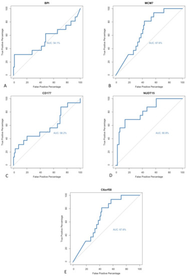 Figure 5). All five of the identified targets had an AUC value >50%. However, within the field of biomarker discovery, the wider research literature suggests that only biomarkers with AUC values >80% should be selected because higher AUC scores are reflective of a superior model with greater diagnostic ability and clinical relevance [