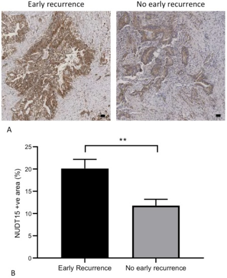 p < 0.01) NUDT15 expression was observed amongst tumours that recurred early when compared to tumours that did not recur within 12 months of resection (
