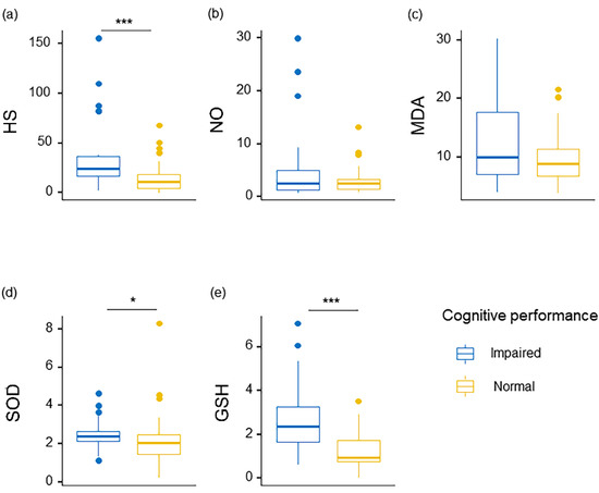 Serum HS concentration and biomarkers of oxidative stress (NO, MDA, SOD, GSH) in the two groups are shown in Table 3, and the comparisons of these factors are visualized in Figure 1. The cognitive impaired group had higher (p < 0.05) concentrations of serum HS, SOD and GSH than the cognitive normal group. Especially, the cognitive impaired group had significant increases in circulating levels of HS and GSH (p < 0.001, PBH < 0.001). After adjustment for BH, serum SOD in these two groups showed no significant differences. Although the pairwise comparisons of serum MDA (p = 0.23) in these two groups had no significant differences, median values of the measure showed a higher-expression trend in the cognitive impaired group than those in the cognitive normal group. Similar to the neurocognitive scores, the cognitive impaired group presented a growing and progressive tendency in oxidative stress biomarkers.