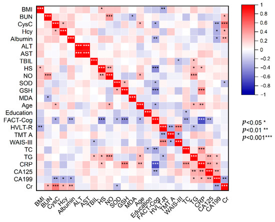 Heat map displaying correlations of cognitive scores with HS, clinical biochemical data and oxidative stress biomarkers. The scale with the bipolar color progression from red to blue on the right of the figure is used to indicate different correlations from positive to negative correlations. Asterisks indicate statistical significance (* p < 0.05, ** p < 0.01, *** p < 0.001).