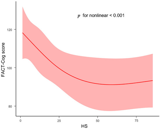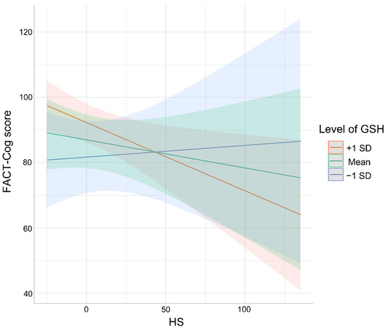 To determine whether oxidative stress markers as a moderator variable (W) moderated the relationship between FACT-Cog scores (Y) and HS concentrations (X), moderation analysis was performed after adjusting the covariates (age, education and gender). Tests of simple slopes were performed to compare three levels of GSH concentration including high (+1 SD), mean (m), low (−1 SD). The moderation model was built using the R package (gvlma and sjPlot). Furthermore, the hypothetical non-linear relationship between HS and cognitive performance was evaluated by restricted cubic splines. In this nonlinear model, HS concentration was allowed to be adjusted for GSH, age, gender and education.