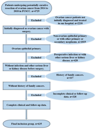 In total, 635 female patients initially diagnosed pathologically as having EOC and surgically treated in Fudan University Shanghai Cancer Center (FUSCC) from 2014 to 2018 were consecutively enrolled in this retrospective observational study. All recruited patients achieved optimal debulking surgery, with the maximum diameter of residual tumor being less than 1 cm, followed by platinum-based chemotherapy. The inclusion criteria included patients initially diagnosed and pathologically confirmed as having OC in our center. The exclusion criteria included (1) patients not initially diagnosed and surgically treated in FUSCC; (2) non-ovarian epithelial primary or with other primary or secondary neoplasms; (3) preoperative infection or another serious liver or kidney disease; (4) a family history of tumors; and (5) incomplete clinical or follow-up data (Figure 1). This study was approved by the institutional research ethics committee of FUSCC (approval number 2019-Y022).