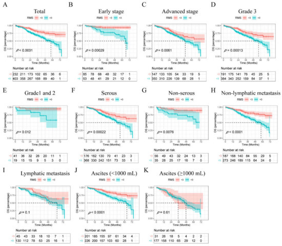 Kaplan–Meier curves were employed to assess the effects of RMS on patients’ OS. The results show that the OS proportion decreased with an RMS equal to or larger than 3 before the operation (Figure 2A). Subgroup analyses showed significant differences in FIGO stage (early: p = 0.000, advanced: p = 0.006), grade (3: p = 0.000, 1 or 2: p = 0.012), histology (serous: p = 0.000, non-serous: p = 0.008), lymphatic metastasis (non-lymphatic metastasis: p < 0.0001) and ascites (volume < 1000 mL: p < 0.0001) based on RMS (Figure 2B–K).
