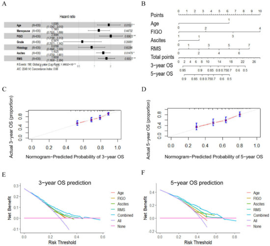 OS prediction based on RMS, age, FIGO stage and ascites volume. (A) Multivariate Cox analysis revealed age, FIGO, ascites and RMS to be independent risk factors for OS prediction. * p < 0.05, ** p < 0.01. (B) Nomogram to predict OS survival probability at 3 and 5 years. (C) Calibration curve for the nomogram predicting 3-year OS. (D) Calibration curve for the nomogram predicting 5-year OS. (E) DCA for the nomogram predicting 3-year OS. (F) DCA for the nomogram predicting 5-year OS. DCA, decision curve analysis.
