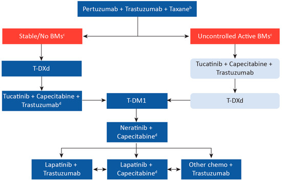 Suggested Treatment Sequence Algorithm for Metastatic HER2-Positive Breast Cancer in Canada Based on Clinical Trial Data a. a Arrows represent treatment sequencing upon disease progression or toxicity and are suggestions only; clinical judgment must always be considered. Note that clinical data is based on historical treatment sequencing, and there remain data gaps in sequencing (e.g., use of T-DM1 following T-DXd). However, despite gaps in data, continual suppression of HER2 is considered critical. b Consider the response length if pertuzumab was used in the neoadjuvant setting. c Prior review with radiation oncology should be completed. As per the ASCO 2018 guidelines, patients with symptoms or a history of brain metastases should undergo imaging for brain metastases. However, we would consider baseline brain imaging also for untreated asymptomatic patients. Where local intervention with radiotherapy and/or surgery is not indicated, patients with uncontrolled BMs, or in the minority of patients with BMs and no visceral disease, we recommend tucatinib + capecitabine + trastuzumab. All patients should also be considered for clinical trials. d If no previous exposure to capecitabine. BM, brain metastases; T-DM1, ado-trastuzumab emtansine; T-DXd, trastuzumab deruxtecan.