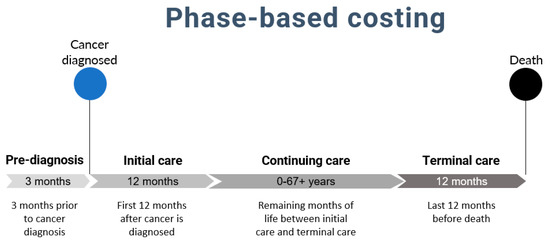 In addition, for each person diagnosed with cancer, the model estimates cancer treatment costs using a phase-based costing method (Figure 2), commonly used for estimating costs of cancer care [10,11]. The duration of the phases of care was determined from previous literature on costs of cancer which, in turn, was based on clinical knowledge of the disease and patterns in the data [10,12,13]. Figure 2 provides the definition and duration of care phases according to the phase-based costing method. For example, in the model, if a person died from cancer 10 years after a cancer diagnosis, this person would incur costs during the pre-diagnosis phase (3 months), the initial phase of care (12 months after diagnosis, including date of diagnosis), the continuing phase of care (the remaining months of life between the initial and terminal phases of care, i.e., 8 years in this case) and the terminal phase of care (last 12 months before death-which may or may not be due to cancer).