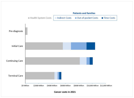 Costs incurred by patients and families were highest in the initial care phase and lowest in the terminal care phase. Patients and families experiencing the smallest burden in the terminal care phase is likely since in the last 12 months of life cancer patients spend more time in the hospital, receiving end of life care. During this time, patients will primarily be using direct health system resources rather than spending their own money on homecare, outpatient drugs, at-home devices, and so on. Overall, our analysis found that the total economic burden in the continuing phase of care was almost as large as those in the initial phase of care-this is mostly attributable to health system costs. This result is likely since 85% of living people ever diagnosed with cancer were in the continuing care phase. Additionally, the duration of the continuing care phase may span several years whereas, the initial and terminal phases of care are only 2 years of the cancer trajectory, collectively. This suggests that long-term complications from initial cancer treatments, prolonged cancer treatments (such as maintenance treatments), follow-up care, and surveillance could have a large impact on the overall economic burden of cancer.