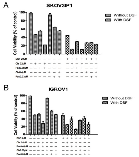 Verification of enhancement of chemotherapy drug effect by DSF. SKOV3IP1 cells (A) and IGROV1 cells (B) were treated at indicated drug concentration or drug combinations for 72 h. Cellular viability was detected by MTT assay. Untreated cells were used as control. Cis: cisplatin. Pac: paclitaxel. DSF: disulfiram. All data presented are representative of three independent experiments.