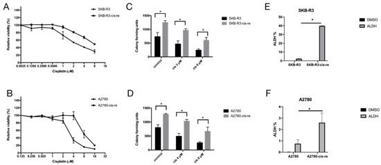 To further explore the cell line stemness, i.e., cancer stem-like cell frequency in the cell lines, we performed an ALDEFLUOR assay that detects ALDH-positive cells that have stem cell features, as we have shown before [7,16]. Our results showed that in comparison with the parental cell lines, the cisplatin-resistant cell lines contained higher numbers of an ALDH+ population. Cell lines SKB-R3-cis-re vs. SKB-R3 had 39.85% vs. 2.355% ALDH+ cells, respectively (p < 0.05), while the cell lines A2780-cis-re vs. A2780 had a proportion of 2.6% vs. 0.75% ALDH+ cells (p < 0.05) (Figure 2E,F).
