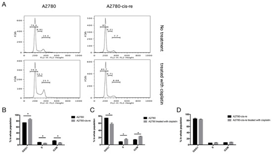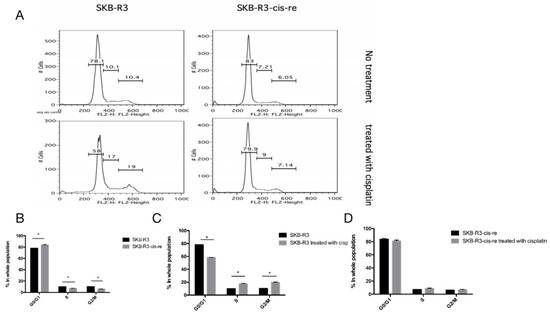 In the cell culture, the cisplatin-resistant cells grow markedly slower than the parental cells. We compared the doubling time and cell cycle parameters in these two cell lines. Figure 3A shows the growth curves of both cell lines. The doubling time of SKB-R3-cis-re cells (40 h) is significantly longer than that of the parental cells (24.8 h, p < 0.05). Likewise, the doubling time of A2780-cis-re cells (29.36 h) is also significantly longer than that of A2780 cells (20.95 h, p < 0.05) (Figure 3A,B). Flow cytometry analysis of the cell cycle indicated that in comparison to the parental cell lines, the cisplatin-resistant cell lines had significantly higher G0/G1 and lower S-phase and G2-phase populations. After cisplatin treatment (concentration of IC50 for 72 h), the population of G0/G1 phase increased, while S-phase and G2-phase population decreased significantly in SKB-R3 and A2780 cells (p < 0.05) (Figure 4 and Figure 5). These data are in agreement with results from other labs supporting that cisplatin displays its cytotoxic effects on cancer cell lines by arresting the cell cycle in the G2/M phase. However, our results showed that no significant cell cycle changes were induced by cisplatin treatment in SKB-R3-cis-re and A2780-cis-re cells at the same cisplatin concentration.