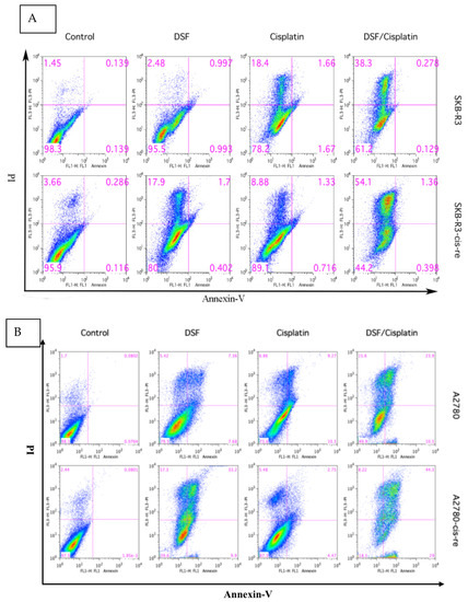 The apoptotic status was determined by flow cytometry with FLUOS-conjugated Annexin-V and propidium iodide Kit (Roche, Mannheim, Germany). Cells (4 × 104/well) were incubated in a 24-well plate overnight and treated with 5 μM cisplatin alone or 1 μM DSF alone or in combination for a further 72 h. All cells were then harvested and suspended in 100 μL binding buffer containing FITC-conjugated Annexin-V (2 µL)/PI (2 µL) and incubated at RT for 15 min in the dark. Apoptosis and necrosis were evaluated measuring FL3 (PI) and FL1 (Annexin-V) in events gated to single cells by FSC/SSC by FACS analysis. Viable cells were Annexin-V−/PI−, early apoptotic cells were Annexin-V+/PI−, late apoptotic cells were Annexin-V+/PI+ and necrotic cells were Annexin-V-/PI+. Early and late apoptosis was combined considering total apoptosis.