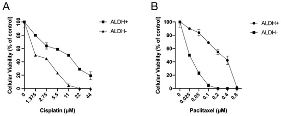Next, ALDH+ and ALDH− cells which were FACS-sorted from A2780-cis-re cells were then treated with cisplatin (0–44 μM) or paclitaxel (0–0.8 μM) for 72 h and subjected to MTT assay. As shown in Figure 7, ALDH+ cells were more resistant to cisplatin or paclitaxel treatment compared to ALDH− cells at any concentration investigated. The relative cellular viability was significantly higher in ALDH+ cells than ALDH− cells after cisplatin or paclitaxel treatment at the same concentration (p < 0.05). These results suggested that ALDH+ cells were relatively more resistant to chemotherapeutics which also indicated the vital roles of ALDH when cells respond to cisplatin treatments.