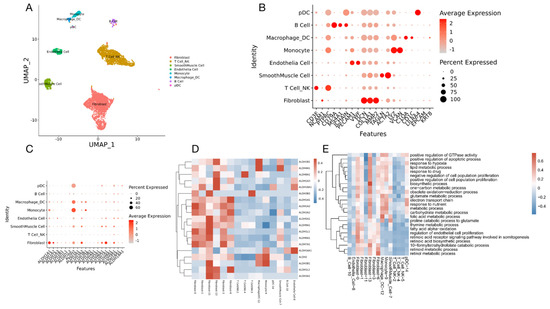 scRNA-Seq analysis of a high-grade serous ovarian cancer. (A) UMAP representation of all single cells color-coded for their assigned major cell type. (B) The expression of the marker genes used for the cell type annotation is indicated on the DotPlot. (C) DotPlot visualization of ALDH genes listing on scRNA-seq clusters. Cell types are listed on the y-axis, and ALDH genes are listed along the x-axis. Dot size reflects the percentage of cells in a cluster expressing each gene; dot color reflects expression level (as indicated in legend). (D) Heat map showing scaled expression of ALDH genes among different cell types. (E) GO terms showing all pathways including ALDH genes.