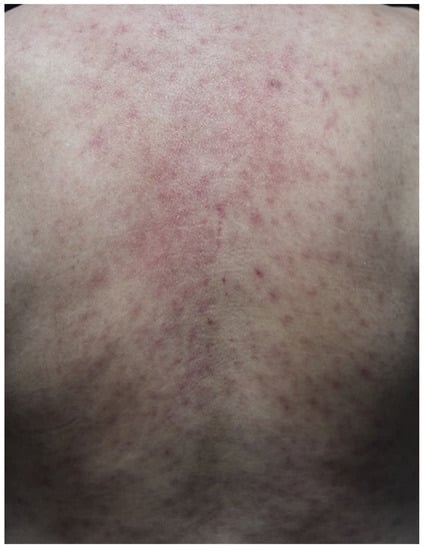 The development of maculopapular rash is observed in approximately 49% to 68% of patients receiving anti-CTLA-4 agents, compared with 20% of patients receiving anti-PD1/PDL-1 therapy, and the eruption usually occurs within the first 3 to 4 weeks after the initiation of ICI therapy [33,56,57]. The clinical presentation is relatively nonspecific and characterized by pruritic erythematous macules and papules coalescing into thin plaques, with the trunk and extremities mainly affected (Figure 1). The lesions usually spare the face, palms, and soles. In some cases, it appears as an exacerbation of a pre-existing skin condition, such as eczema or rosacea [33]. Histologically, superficial, perivascular lymphocytes and eosinophils infiltrate into the upper dermis, and mild epidermal spongiosis can be present [33].