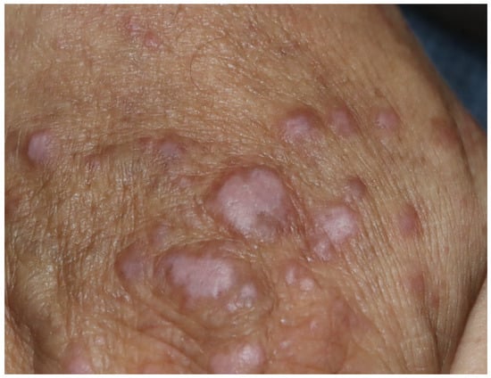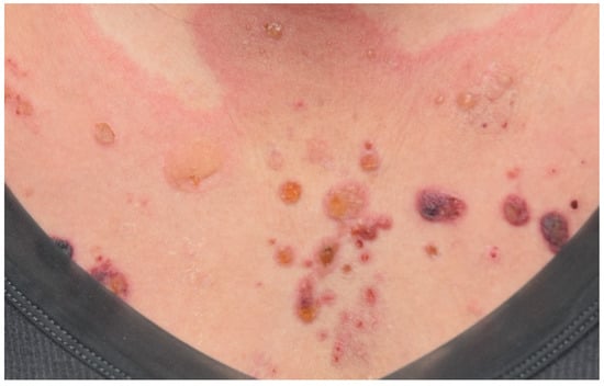 Compared with other dermatoses, immunobullous disorders are relatively rarely reported in the literature, with most associated with anti-PD-1/PD-L1 blockades [47,68,86,87,88]. In a retrospective analysis including 853 patients receiving anti-PD-1/PD-L1, the incidence of bullous skin toxicity was approximately 1%, with bullous pemphigoid (BP) appearing to be the most common presentation, followed by bullous lichenoid dermatitis and linear IgA bullous dermatosis [47]. The clinical manifestation of BP is usually characterized by pruritic, tense bullae overlying the urticarial plaques mainly on the trunk and extremities (Figure 3); however, urticarial-like or eczematous rash may be the prodromal presentation or the “non-bullous” variants [89,90]. Involvement of the mucosal membrane is less frequent [48,63].