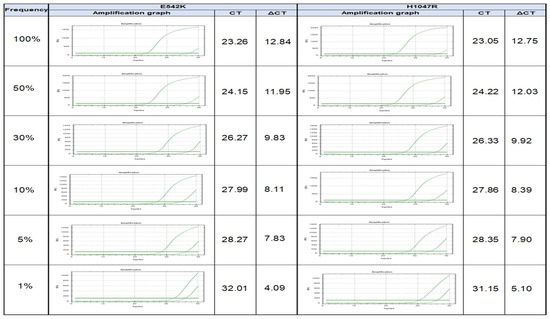 To investigate the detection capability of the method (PNA clamp real-time PCR), PIK3CA-mutated (A549 cell line) DNA was serially diluted to generate samples containing 100, 50, 20, 10, 5, and 1% of PIK3CA-mutant alleles (E542K and H1047R, respectively), which were subjected to PNA clamp real-time PCR to independently determine each detection rate of the diluted PIK3CA-mutant alleles. The ΔCt1 values of the 100-, 5-, 2-, 10-, 5-, and 1%-mutant samples were 12.84, 11.95, 9.83, 8.11, 7.83, and 4.09 for E542K-mutant alleles and 12.75, 12.03, 9.92, 8.39, 7.90, and 5.10 for H1047R-mutant alleles, respectively. According to a ΔCt1 cutoff point of ≥2.0, the PNA clamp real-time PCR assay was capable of identifying the PIK3CA mutation in a 1%-mutant population (Figure 1).