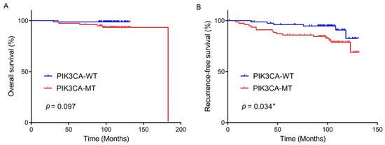 Overall survival rate (A) and recurrence-free survival rate (B) by PIK3CA mutational status in the patients with breast cancer who underwent curative surgery and adjuvant chemotherapy. * statistically significant, p value < 0.05.