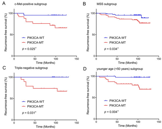 Prognostic impact of PIK3CA mutation in breast cancers according to subgroups. The presence of PIK3CA mutation predicts unfavorable recurrence-free survival of patients with c-Met-positive tumors (A), MSS tumors (B), triple-negative subtype (C), age younger than 50 years old (D). * statistically significant, p value < 0.05.