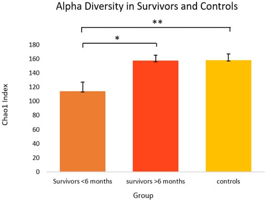 Alpha diversity on the Chao1 index in cancer survivors and healthy controls. Group means are presented. Significance is denoted by * at the p < 0.05 level, and ** at the p < 0.01 level. Error bars represent standard error of the mean (SEM). Group n = 7, 10, and 18, respectively.