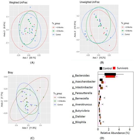 Analysis of beta diversity using principal coordinate analysis (Figure 2A–C) with Bray–Curtis distances found no significant differences between survivors ≤6 months post-treatment, survivors >6 months post-treatment, and healthy controls. Despite the lack of differences in overall community structure, differential taxonomic abundance analysis showed significantly increased relative abundance of bacteria from Selenomondales (p < 0.05), Veilloneliaceae (p < 0.05) (data not shown), and Intestinibacter (p = 0.04) in survivors compared to controls. Moreover, decreased relative abundance of Barnesiella (p = 0.03), Bilophila (p = 0.01), and Anaerotruncus (p = 0.04) was also observed in survivors (see Figure 2D).