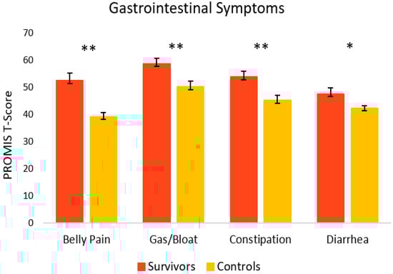 Gastrointestinal symptoms in cancer survivors and healthy controls. Group means are presented. Error bars represent standard error of the mean (SEM). Significance is denoted by ** at the p < 0.01 level, and * at the p < 0.05 level. Group n = 13–18.