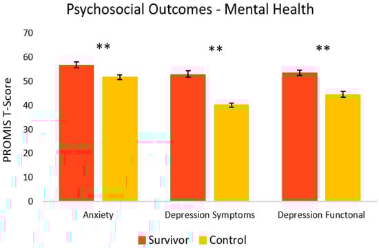 Psychosocial mental health-related outcomes in cancer survivors and healthy controls. Group means are presented. Error bars represent standard error of the mean (SEM). Significance is denoted by ** at the p < 0.01 level. Group n = 17–18.