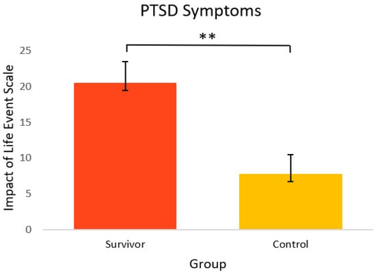 PTSD symptoms in cancer survivors and healthy controls. Group means are presented. Error bars represent standard error of the mean (SEM). Significance is denoted by ** at the p < 0.01 level. Group n = 14–10.