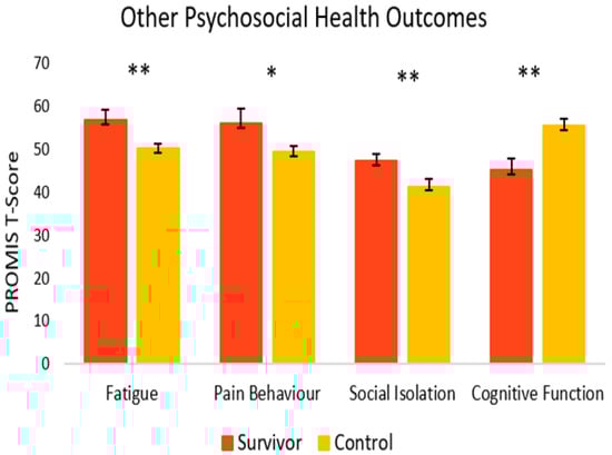 As seen in Figure 6, for other psychosocial health outcomes, survivors also fared worse. Compared to controls (M = 41.4, SEM = 1.7), survivors had significantly greater symptoms of social isolation (M = 47.4, SEM = 1.6) [t(33) = 2.56, p = 0.008, 95% C.I. = 1.22, 10.74]. Survivors also reported significantly more fatigue (M = 56.9, SEM = 2.3) [t(22) = 2.64, p = 0.008, 95% C.I. = 1.41, 11.81] and more pain behavior (M = 56.1, SEM = 3.4) [t(9) = 1.83, p = 0.05, 95% C.I. = −1.56, 14.65] compared to controls (M = 50.3, SEM = 1.0 and M = 49.5, SEM = 1.2, respectively). Survivors reported significantly lower cognitive function (M = 45.3, SEM = 2.5), [t(28) = −3.43, p = <0.001, 95% C.I. = −16.24, −4.09] compared to healthy controls (M = 55.4, SEM = 1.6).