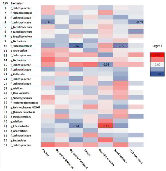 Heatmap of correlations between psychosocial outcomes and ASVs at the order (o), family (f), and genus (g) levels in cancer survivors. Spearman’s rho is presented. (Values for n range from 10–17).