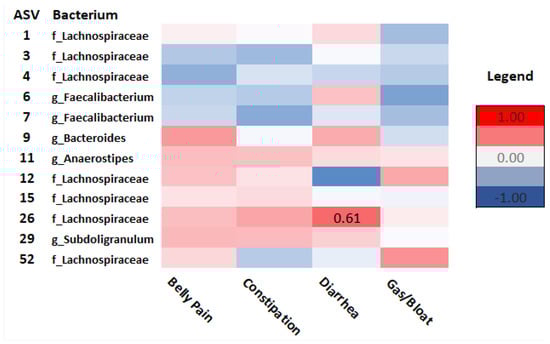 Heatmap of correlations between GI outcomes and ASVs at the order (o), family (f), and genus (g) levels in cancer survivors. Spearman’s rho is presented. (Values for n range from 10–17).