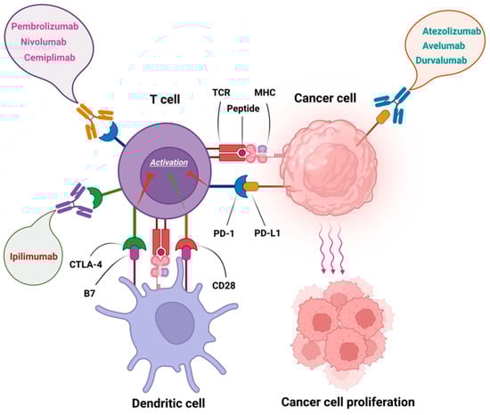 Ipilimumab (Yervoy) is a human IgG1 mAb that can inhibit the function of CTLA-4 and was first approved and recommended for the treatment of melanoma in 2011 [81]. Ipilimumab is also used in the treatment of advanced renal cell carcinoma, MSI-H/dMMR metastatic colorectal cancer, malignant pleural mesothelioma, NSCLC, and hepatocellular carcinoma when combined with Opdivo (nivolumab) [82]. In 2020, the FDA announced that Opdivo (nivolumab) plus Yervoy (ipilimumab) (given as intravenous injections) have therapeutic benefits for adult patients with unresectable malignant pleural mesothelioma (MPM), and NSCLC (with tumour PD-L1 expression ≥1% and no EGFR/ALK aberrations) as a first-line treatment [83]. Nevertheless, CTLA-4 as a negative regulator of T cell immunological responses, is implicated in autoimmunity prevention; therefore, its blockage with ipilimumab may cause immune related adverse effects (irAEs) such as colitis and enterocolitis [84].