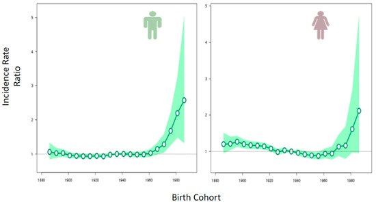 Risk of colorectal cancer by birth cohort, Canada 1888–1988. Reprinted with the permission from Ref. [6] 2019.