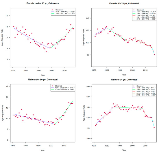- Decker, K.M.; Lambert, P.; Bravo, J.; Demers, A.; Singh, H. Time Trends in Colorectal Cancer Incidence Rates by Income and Age at Diagnosis in Canada from 1992 to 2016. JAMA Netw. Open 2021, 4, e2117556. [Google Scholar] [CrossRef] [PubMed]