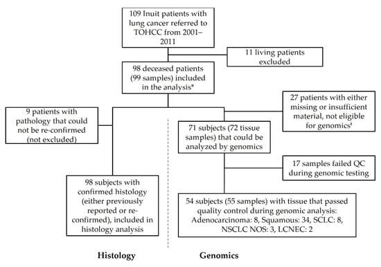 Flow diagram of study subjects. Inuit patients with lung cancer referred to the Ottawa Hospital Cancer Center from the Baffin region of Nunavut between 2001 and 2011. Subjects were assessed for inclusion/exclusion, with the primary criteria being survival status. Pathology specimens sought from all cases were reviewed when available and for those patients with sufficient tissue, molecular analysis was conducted. * One case had two primary lung cancers that were considered as distinct tumors though they originated from the same patient. ‡ These cases included blocks not available, blocks with insufficient tissue and blocks that failed H&E review at Contextual Genomics (now Imagia Canexia Health). LCNEC, large cell neuroendocrine carcinoma; NOS, not otherwise specified; NSCLC, non-small cell lung cancer; QC, quality control; SCLC, small cell lung cancer; TOHCC, The Ottawa Hospital Cancer Center.