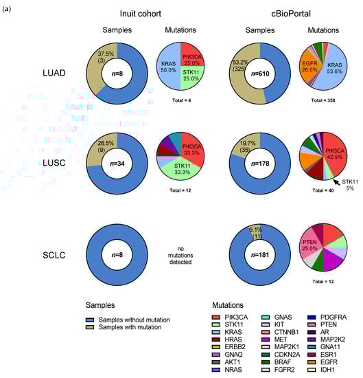 For each histological subtype, we examined overall mutation rates of tumors from our study population and compared them to cBioPortal, a large electronic repository of cancer genomics data sets [28,30] (Figure 3a). LCNEC (n = 2) and NSCLC NOS (n = 3) were excluded from the graphical representation as their small sample size limits meaningful interpretation. In the Inuit cohort, excluding synonymous mutations, we detected somatic alterations in 37.5% (3/8) of adenocarcinoma samples, 26.5% (9/34) of SCC samples and 0% (0/8) of SCLC samples, compared to cBioPortal where mutation rates for these histological subtypes were, respectively, 53.2%, 19.7% and 6.1%. The difference in overall somatic mutation rate for each histological subtype did not differ statistically between the Inuit and cBioPortal cohorts (Fisher’s exact test), though the small sample size from our study likely precludes meaningful analysis. Three genes accounted for 14 of 17 (82%) detected missense mutations: STK11, PIK3CA and KRAS (Figure 3a). The three (3) adenocarcinoma cases with detected mutations included: KRAS (2) and PIK3CA-STK11 (1). Each mutated gene is expressed as a percentage of all mutations found (Figure 3a), and thus does not exactly match the number of samples, as some samples had co-occurring mutations. KRAS mutations represented 50% (2/4) of all mutations in the Inuit adenocarcinoma samples, compared to 53.6% (192/358) of cBioPortal adenocarcinoma mutations. Non-synonymous EGFR mutations were not detected in any Inuit adenocarcinoma case, whereas they represented 26.0% of all mutations in the cBioPortal cohort. In the nine (9) SCC cases with detected mutations, the most common, STK11 F354L and PIK3CA E545K, were identified in four samples each, with KRAS, HRAS, MAP2K2 and GNA11 (one each) making up the remaining detected mutations. In three (3) of those individuals, the mutations were co-occurring (STK11-MAP2K2 (stop), PIK3CA-GNA11 (stop) and PIK3CA-HRAS). PIK3CA mutations represented 33.3% of mutations in the Inuit cohort (4/12) and 42.5% (17/40) of mutations in cBioPortal (p = 0.7407, Fisher’s exact test). Interestingly, while mutations in STK11 represented 33.3% (4/12) of mutations in the Inuit cohort, they accounted for only 5% (2/40) of cBioPortal samples (neither of which were the F354L variant), (p = 0.0206, Fisher’s exact test). One of three NSCLC NOS cases had a non-synonymous KRAS mutation. We detected no non-synonymous hotspot mutations in any SCLC case tested (0/8), although the FIND ITTM panel did not include TP53 and RB1, the genes most commonly mutated in this subtype. There were no non-synonymous mutations detected in cases of LCNEC (0/2). Across all Inuit samples, STK11 and PIK3CA were found to be mutated exclusively in the F354L (1062C > G) and E545K (1633G > A) positions, respectively.