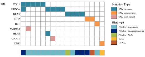 Fifty cases are illustrated in Figure 3a (low frequency histologies, carcinoma NOS (n = 3) and LCNEC (n = 2), are excluded). Overall, there were 17 genetic alterations (insertions/deletions and SNVs), excluding synonymous mutations, found in 12 of 55 samples (21.8%), which include: STK11 (in 5 samples; 9.1%), PIK3CA (in 5 samples; 9.1%), KRAS (in 4 samples; 7.3%), and GNA11, HRAS and MAP2K2 in 1 sample each. Four cases had co-occurring mutations: GNA11-PIK3CA, HRAS-PIK3CA, STK11-PIK3CA and STK11-MAP2K2. Synonymous variants were found in IDH2 (two cases), RET and EGFR, and are shown in Figure 3b. Non-synonymous (missense) SNVs accounted for nearly all detected alterations, however MAP2K2 and GNA11 harbored a non-sense (stop) mutation. Recurring SNV included STK11 F354L (five samples), PIK3CA E545K (five samples), HRAS/KRAS G12S/V (three samples) and KRAS Q61H (two samples). The full list of detected genetic alterations is found in Table S2.