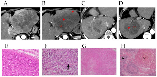 Figure 2 shows CT images in the arterial phase in two HCC patients before lenvatinib treatment (Figure 2A,C), with attenuated early enhancement after lenvatinib treatment (Figure 2B,D). Figure 2E shows the postoperative histopathological findings corresponding to the asterisk (*) in the CT image in Figure 2B; histopathological images of the areas corresponding to the arrowheads in Figure 2B,D are shown in Figure 2F and the arrowhead in Figure 2; and the areas shown by the circles in Figure 2B,D correspond to the histopathological images shown in Figure 2G and the circle in Figure 2H. Postoperative histopathology showed that the tumor contained several degenerated areas (Figure 2G, and the arrowhead in Figure 2H) along with necrotic areas (Figure 2F, and the circle in Figure 2H) in areas with attenuation of early enhancement (arrowhead and circles in Figure 2B,H) in arterial phase CT images after lenvatinib treatment. In addition, some arteries remained undestroyed in the degenerated tumor (Figure 2F arrow). In these four cases of HCC resection after lenvatinib treatment, the histological specimen was subdivided into four regions: liver parenchyma, viable area of the tumor, degenerated area of the tumor, and necrotic area of the tumor, and the corresponding CTav was measured at five points in each region. The association between CTav on preoperative CT images after lenvatinib treatment and postoperative histopathological findings in the four HCC patients are shown in Figure 2I. The CTav corresponding to the “viable area” in the resected HCC specimen was 125.7 ± 10.9 HU (* in Figure 2B), CTav corresponding to “necrotic areas” in the resected specimen was 27.8 ± 8.4 HU (circle in Figure 2B,D), and the CTav corresponding to the “degeneration area” in the resected specimen was 46.7 ± 9.2 HU (arrowhead in Figure 2B,D). The CTav of normal liver parenchyma was 70.1 ± 6.6 HU (Figure 2I).