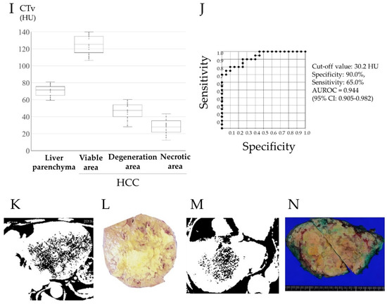 ROC curve analysis of the association between CTav and pathological findings, performed to verify the ability of CTav to predict pathological necrosis, revealed an area under the ROC curve (AUC) of 0.925 (95% CI: 0.886–0.964) at the optimal cut-off value of 30.2 HU for CTav, with 90.0% specificity and 65.0% sensitivity for discriminating between necrosis and degeneration as identified histopathologically (Figure 2J). Based on the above finding, we set <30.2 HU as the CTav indicative of tumor necrosis after molecular targeted therapy for HCC on CT images, and termed this value as N30-CTav. Binary images based on N30-CTav were created, and CT images with black fill for areas with CTav < 30 HU are shown in Figure 2K,M, which represent the region close to the necrotic area in the gross image of the resected specimen (Figure 2L,N).