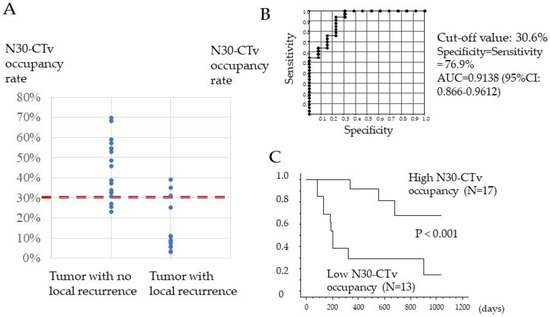 Association between percentage of tumor tissue with CT attenuation values (30 HU) that could be predictive of necrosis (N30-CTav) occupancy and local recurrence-free survival. (A) Distribution of N30-CTav occupancy rates between hepatocellular carcinoma (HCC) tumors with local recurrence and HCC tumors with no local recurrence. N30-CTav, threshold CT value (30 HU) for histological necrosis in tumors diagnosed as complete response after lenvatinib treatment. (B) Receiver-operating characteristic (ROC) curve analysis of the N30-CTav occupancy rate for predicting local recurrence and no local recurrence. AUC, area under the ROC curve. N30-CTav, a CTav of 30 HU was set as the threshold value for histological necrosis. (C) Kaplan-Meier analysis of local tumor progression in 30 tumor lesions with a complete response, stratified by the N30-CTav occupancy rate (grouped by N30-CTav occupancy cut-off values of ≥30.6% and <30.6%).
