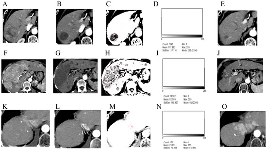 A 74-year-old man presented with HCC predominantly located in segment 8 of the liver (Figure 4K). After 12 weeks of treatment with lenvatinib, contrast-enhanced CT showed disappearance of early enhancement in the tumor area, which was evaluated as CR using mRECIST (Figure 4L). Binary images based on N30-CTav are shown in Figure 4M. A histogram of N30-CTav occupancy in the HCC using Image J analysis on the same binary images indicated an occupancy rate of only 9.0% (Total count-Mode 0 count/Total count: ((177 − 161)/177 = 0.090) (Figure 4N). CT performed four months after the evaluation showed an increase in tumor size with marked early staining (Figure 4O).