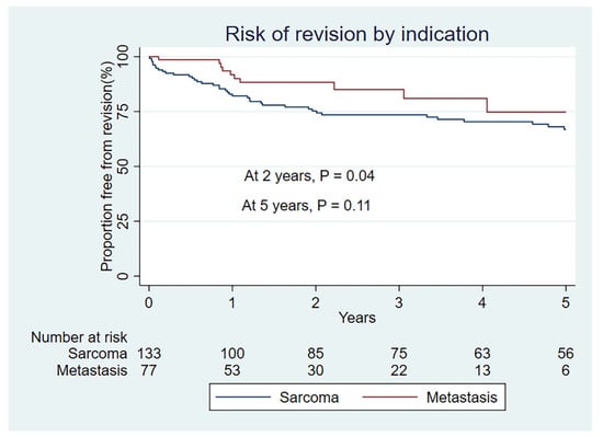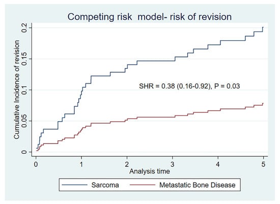 In a competing risk model, the cumulative incidence for risk of revision is significantly lower for metastatic indication than for sarcoma indication, at 5 years (SHR = 0.38 (0.16–0.92)) (p = 0.03), as illustrated by Table 3 and Figure 2.