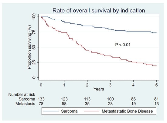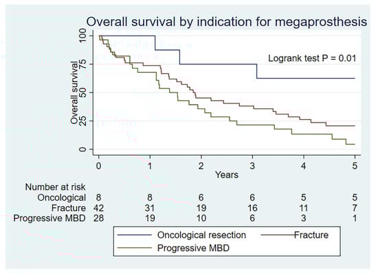 As expected, the overall survival is substantially lower at all time periods for those with a metastatic indication (p < 0.01) (Figure 3). Overall survival is also statistically better for MBD patients undergoing megaprosthetic reconstruction after an oncological resection than for a fracture or progressive MBD (p = 0.01) (Figure 4), which serves to validate our clinical selection.