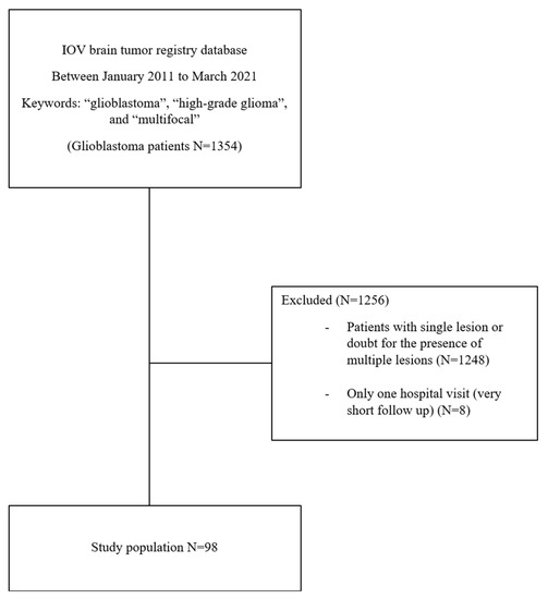 This is a retrospective monocentric study involving the Istituto Oncologico Veneto (IOV) and the University Hospital of Padova (Azienda Ospedale-Università di Padova, AOUP). All patients with mGBM at the time of diagnosis and treated at the IOV between January 2011 and March 2021 were considered. Patients were selected from the IOV brain tumor registry database, searching the following keywords: “glioblastoma”, “high-grade glioma”, and “multifocal”. The systematic retrospective collection of patients’ data was carried out through a computerized electronic medical system containing patient medical records.