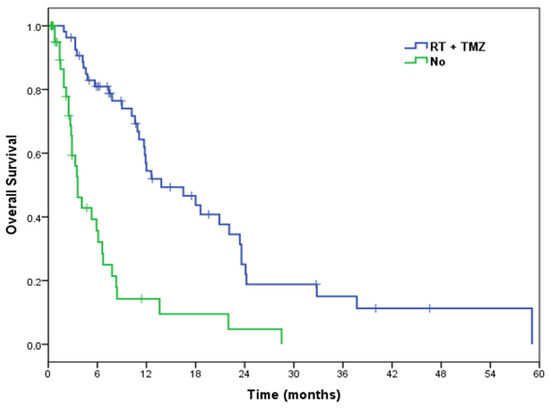On univariate analysis, patients treated with PR had a median OS of 13.8 months (95% CI 6.0–21.6) and those patients who underwent biopsy 10.2 months (95% CI 5.5–14.9) (p = 0.028) (Figure S2). Subjects with ECOG PS 0–2 had a median OS of 11.7 months (95% CI 9.9–13.5) and those with ECOG PS >2 of 3.5 months (95% CI 3.1–3.9) (p = 0.012) (Figure S3). Patients with methylated MGMT promoter had a median OS of 20.9 months (95% CI 6.4–35.4) and patients with unmethylated MGMT promoter 12.6 months (95% CI 10.0–15.2) (p = 0.138) (Figure S4). Patients who received active oncological treatment showed a median OS of 11.1 months (95% CI 8.2–14.0) and patients who had not received it 1.9 months (95% CI 0.7–3.1) (p < 0.001) (Figure S5). Subjects receiving TMZ + RT had a median OS of 13.8 months (95% CI 6.9–20.7) and those who had not received RT + TMZ 3.6 months (95% CI 2.6–4.7) (p < 0.001) (Table 3) (Figure 3).