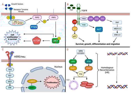 Various genomic pathways implicated in the pathogenesis of urothelial carcinoma. Panel (A) represents the PI3K, AKT, and mTOR pathway. Panel (B) represents the FGFR pathway and its involvement with the JAK/STAT, PI3K, and MAP kinase pathways. Panel (C) represents the HER2 pathway and its involvement with the MAP kinase pathway. Panel (D) represents the homologous recombination alterations and how they lead to pathogenesis of urothelial carcinoma.