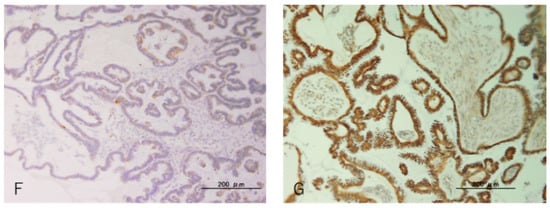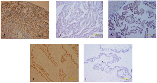 - Nagai, Y.; Kishimoto, T.; Nikaido, T.; Nishihara, K.; Matsumoto, T.; Suzuki, C.; Ogishima, T.; Kuwahara, Y.; Hurukata, Y.; Mizunuma, M.; et al. Squamous Predominance in Mixed-Epithelial Papillary Cystadenomas of Borderline Malignancy of Mullerian Type Arising in Endometriotic Cysts: A Study of Four Cases. Am. J. Surg. Pathol. 2003, 27, 242–247. [Google Scholar] [CrossRef]