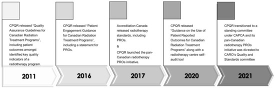Under the guidance of the CPQR, a partnership of Canadian radiotherapy professional societies (the Canadian Association of Radiation Oncology—CARO, Canadian Organization of Medical Physicists—COMP and Canadian Association of Medical Radiation Technologists—CAMRT), pan-Canadian quality improvement (QI) initiatives, including those for PROs, have been feasible, with a relatively small number of cancer centres that provide radiotherapy services (46 total) across the country. Since CPQR’s beginning in 2010, its iterative approach to QI initiatives has supported its evolution to become a leader in Canadian radiotherapy QI and safety [5,6,7]. Since its release of “Quality Assurance Guidelines for Canadian Radiation Treatment Programs” in 2011 [8], CPQR has included reviews of patient outcomes, such as treatment-related toxicity, disease control and survival, amongst its key quality indicators of a radiotherapy program. Since the key quality indicators were embedded into the Accreditation Canada radiotherapy standards in 2017 [9], there is now an expectation that programs not only review physician-reported disease control and toxicity outcomes but also PROs. The Accreditation Canada standards focused attention clearly on the patient with the term “client reported outcomes”. In 2017, CPQR launched a pan-Canadian PROs initiative to support centers striving to meet the accreditation requirement of PROs program implementation.