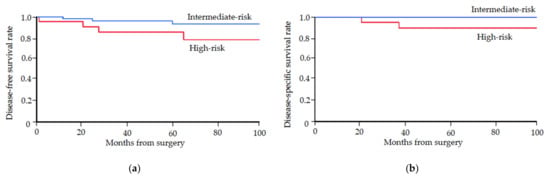 The five-year disease-free survival rates of intermediate-risk and high-risk patients were 96% and 85%, respectively (Figure 1a). The five-year disease-specific survival rates of intermediate-risk and high-risk patients were 100% and 90%, respectively (Figure 1b). The five-year disease-free and disease-specific survival rates of intermediate/high-risk patients were 93% and 97%, respectively.